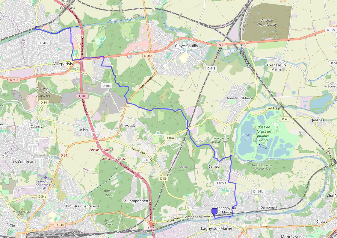 Balade de 17,5 km de la gare de Lagny-Thorigny RER (P) à la gare de Mitry-le-Neuf RER (B)